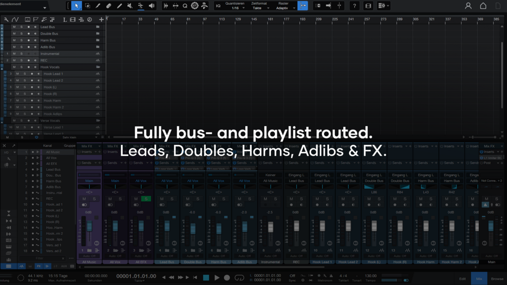 This product contains a professional vocal recording template, including Lead Vocals, Doubles, Harmonies, Adlibs & FX (Verb, Plate, Delay). Fully bus- & playlist routed with easy project overview and maximum processing options.