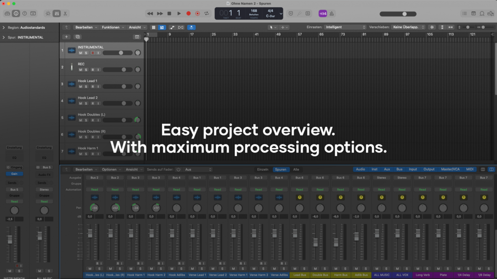 After payment, you will get a professional vocal recording template, including Lead Vocals, Doubles, Harmonies, Adlibs & FX (Verb, Plate, Delay). Fully bus- & playlist routed with easy project overview and maximum processing options.